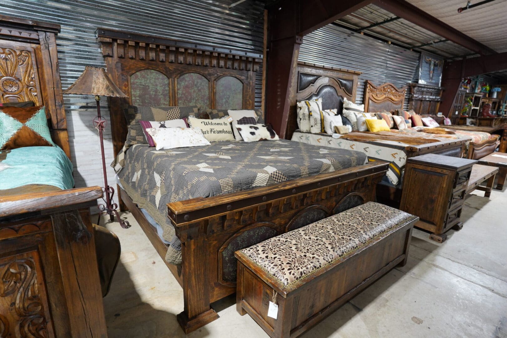 Turquoise distressed hand hammered copper bedroom set with metal band accents and clavos